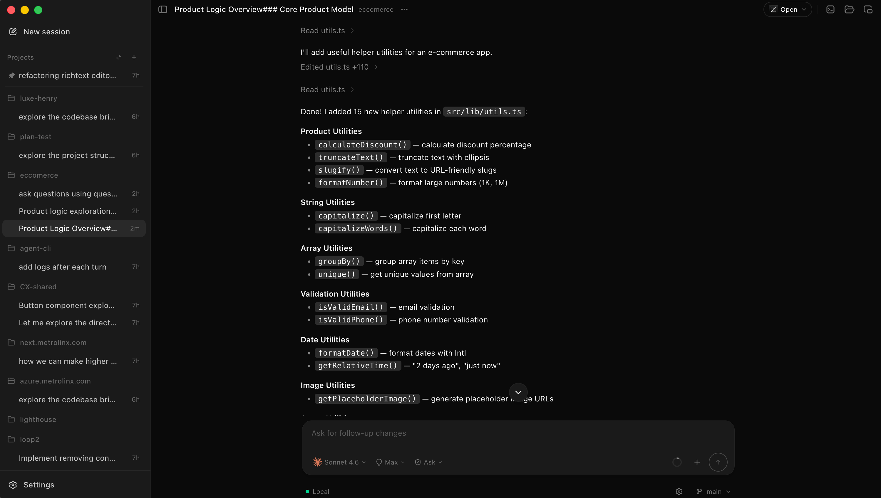Keep model access, terminal output, file changes, and session history close without switching between separate coding tools.